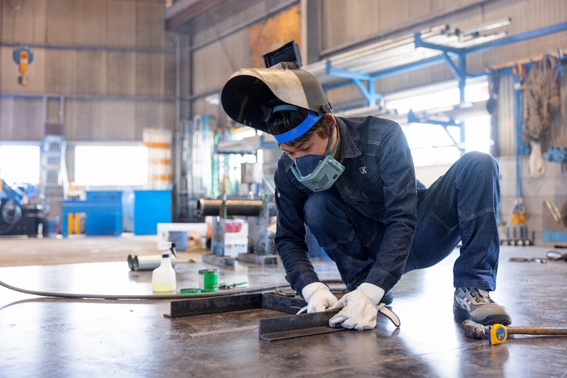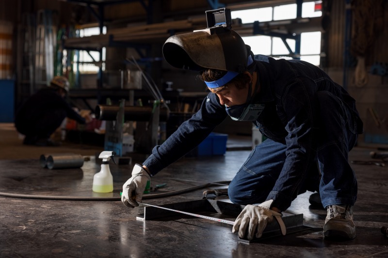 あらかじめ用意された図面や現地調査により、採寸した通りに製造していく工程です。TIG溶接や半自動溶接などを用いて溶接作業を行います。
